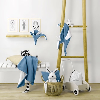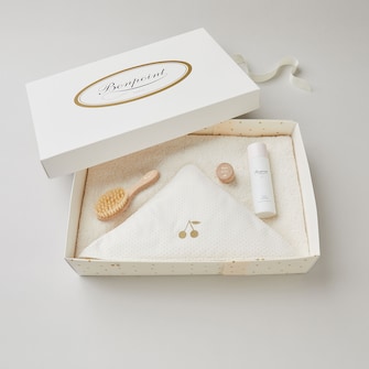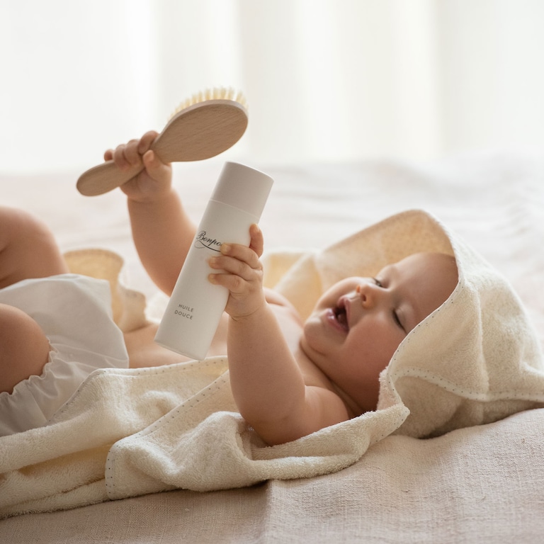 Quelques jouets au bord de la baignoire, un tiroir de salle de bain réservé aux soins de votre bébé. De 6 à 12 mois, l’heure est aux câlins, au bien-être et au plaisir de prendre soin de votre enfant. C’est déjà l’heure du bain ? Bonpoint en fait un rituel d’élégance et de raffinement. À 6 mois, le nouveau-né mérite désormais sa valisette en coton. À l’intérieur, un assortiment exquis : une brosse à cheveux en bois, une sortie de bain en voile de coton, une huile de douche nourrissante. Complétée par l’eau de soin parfumante de Petit Bateau. Après tout, il n’y a pas d’âge pour prendre soin de soi — pas plus qu’il y en a pour choisir le fidèle compagnon qui lui ressemble le mieux : Lilo le lapin, Kili le koala et Gisèle la girafe, les doudou-langes de Petit Bloom attendent avec impatience de donner de l’amour, et d’être choyés en retour.