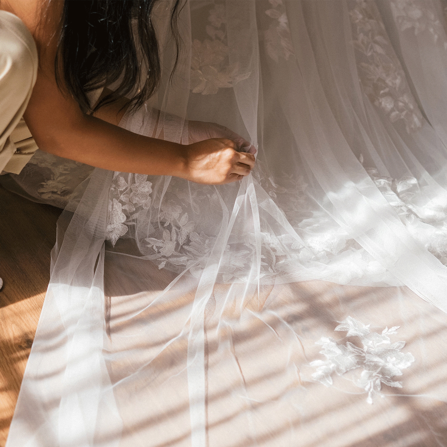 Clin d'œil à l’élégance rétro, les gants font leur retour et accompagnent des robes d’une grande simplicité. En 2024, ils attirent tous les regards et se portent jusqu’au coude ou mi-bras. “Ils se marient à des tenues légères, à de fines bretelles, ou assortis une petite traîne. Je les confectionne dans le même tissu que le vêtement — en satin duchesse ou dans une très belle dentelle.”