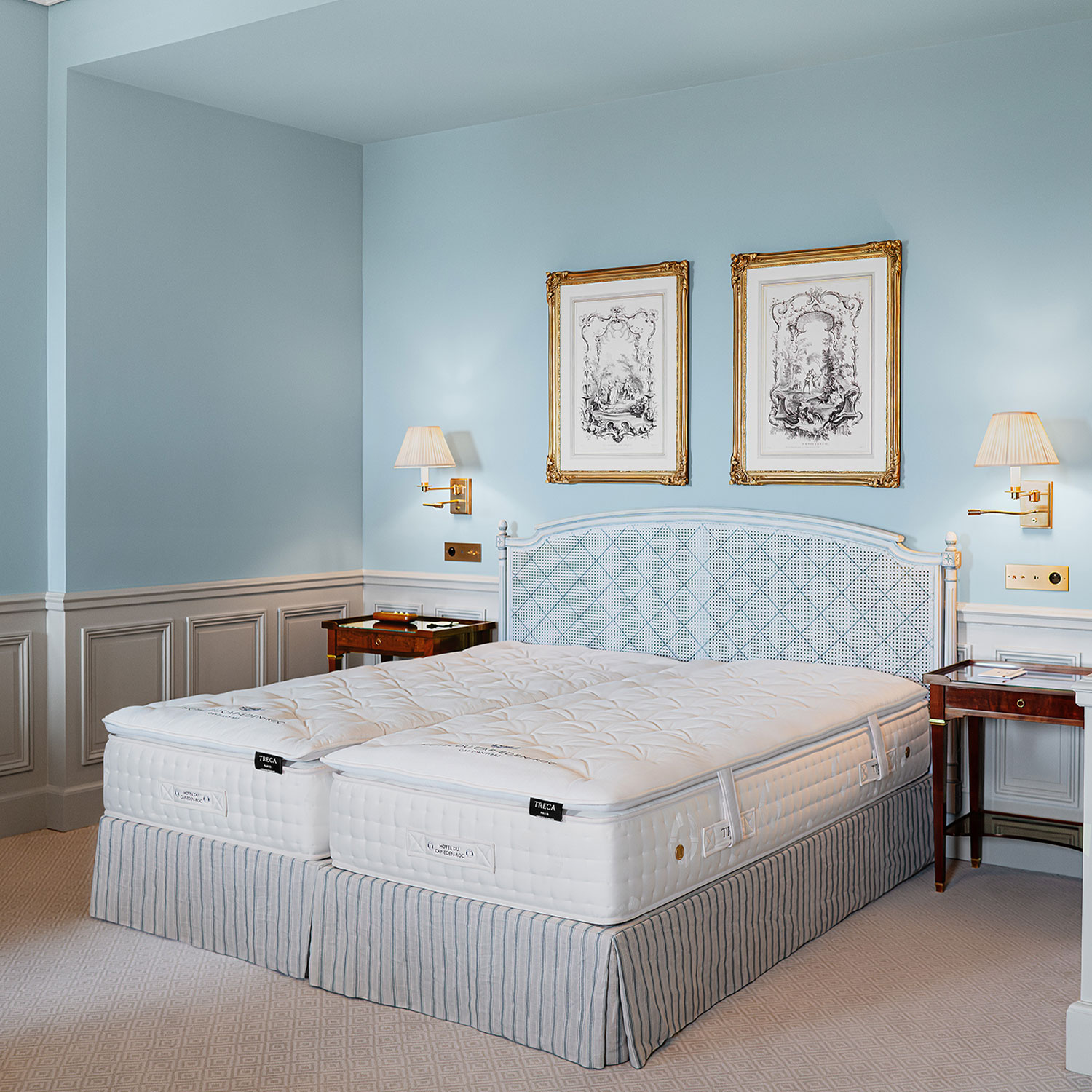 Tréca a minutieusement sélectionné chaque composant de l'ensemble des la literie du l'Hôtel. Les matières naturelles, nobles et généreuses, telles que la laine Mérinos d’Arles et le latex naturel d’hévéa, sont associées aux techniques artisanales propres aux ateliers Tréca, comme le capitonnage intégral à la main. Cette conception exclusive, brevetée par Tréca, est pensée pour réduire les composants chimiques et augmenter le confort de chaque visiteur. Le matelas respire, apportant la fraîcheur nécessaire en été et un confort moelleux en hiver. Côté décoration, le coutil est personnalisé aux couleurs de l’hôtel et la poignée en tête de matelas a été ajoutée spécialement pour cette collaboration. Chaque élément de cette literie incarne l’excellence et le raffinement, faisant de chaque nuit un voyage sensoriel vers le bien-être.