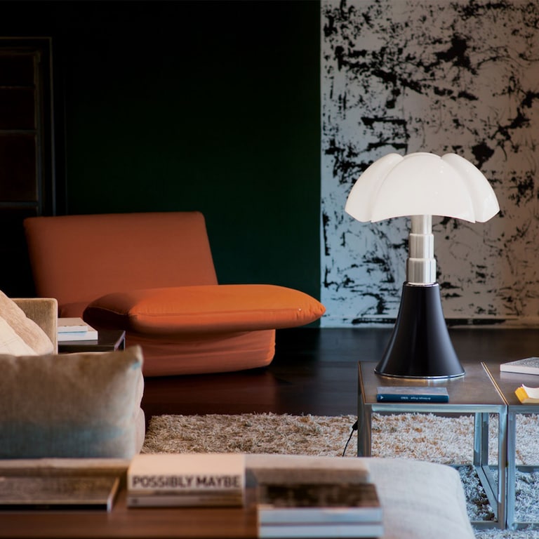 1. La lampe Pipistrello de Gae Aulenti. “Un modèle inspiré de la chauve-souris que l’on ne présente plus. Elle est très appréciée par les futurs mariés. Avec ses lignes gracieuses, disponible en plusieurs formats, elle occupe l’espace avec beaucoup d’élégance. À poser sur une enfilade d’époque, ou directement au sol. ”