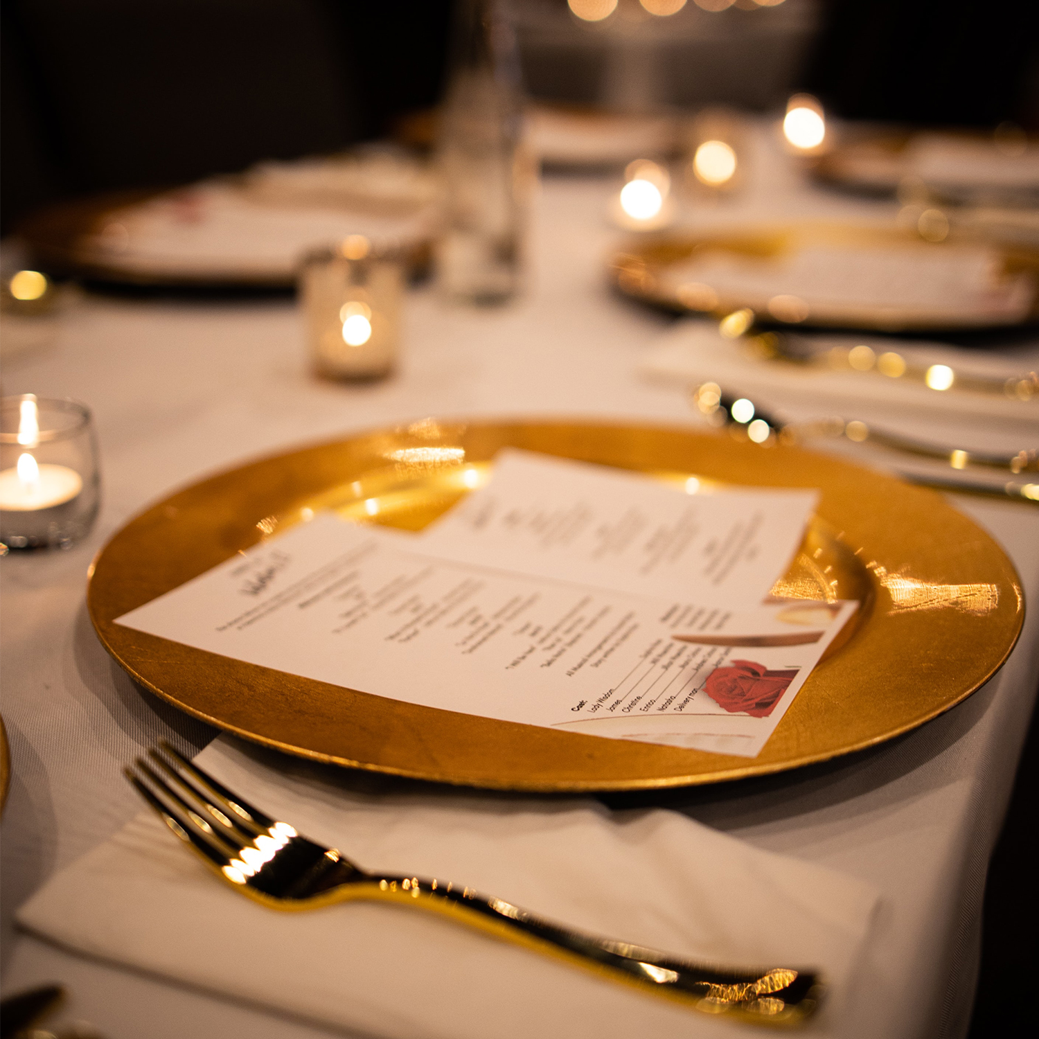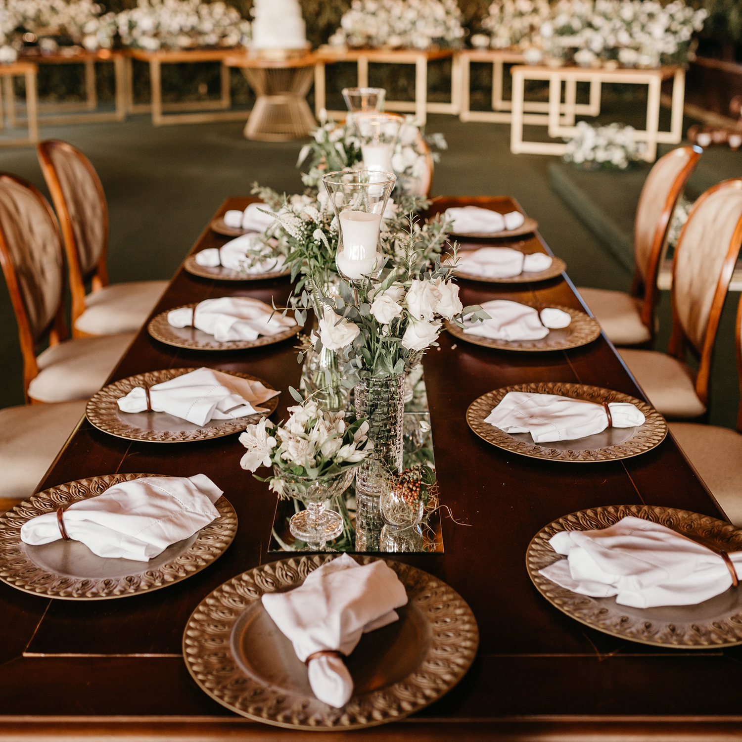 Sans copier les décorations de Noël, utilisez la couleur dorée pour illuminer la salle de réception. À mélanger avec des touches argentées pour rendre l’ambiance encore plus chic. Sur une nappe blanche, installez un service en argent et alignez des chandeliers couleur or. Jouez sur les détails en imprimant le menu en lettres platine et en emballant les cadeaux des invités dans des boîtes du même ton. Égayez les chemins de table avec des traînées de poudre lumineuse et osez la pièce montée couverte d’éclats dorés. En les utilisant par petites touches, vous ferez des étincelles avec ces tons (absolument ) festifs !